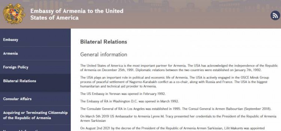 «Հրապարակ» թերթը գրում է. «ԱՄՆ-ում Հայաստանի դեսպանության պաշտոնական կայքէջում, ինչպես նաեւ ֆեյսբուքյան պաշտոնական էջում սեւով ապիտակի վրա գրված է, որ ԱՄՆ-ն Հայաստանի կարեւորագույն գործընկերն է: Ոչ թե կարեւոր գործընկերներից մեկը, այլ հենց կարեւորագույնը: