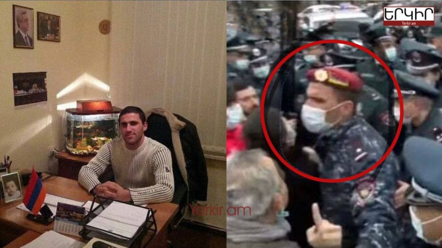 ՀՀ ոստիկանության Երևան քաղաքի վարչության հատուկ նշանակության («կարմիրբերետավորների») գումարտակը մշտապես առանձնացել է իր որոշ ներկայացուցիչներով, որոնք իրենց արյունարբու պահվածքով առանձնակի ուժգնությամբ են ուզեցել ցույց տալ իրենց հավատարմությունը շեֆերին: Նոյեմբերի 11-ը ևս բացառություն չէր: Այս անգամ ասպարեզում էր գումարտակի պետի տեղակալ, Կարտոշկա Խչո մականունով հայտնի Խաչիկ Թովմասյանը: Նա, ինչպես տեսնում եք առաջին լուսանկարում, ժամանակին առանձնակի հպարտությամբ է լուսանկարվել Սերժ Սարգսյանի լուսանկարի տակ: Երկրորդ լուսանկարում, իր գլադիատորական պահվածքով հարձակվելով խաղաղ ցուցարարների վրա, նա արդեն հավատարմության նոր երդում է տալիս Փաշինյանի հայրենավաճառ իշխանությանը: