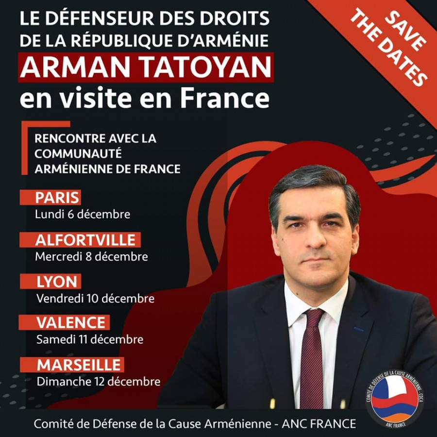 Դեկտեմբերի 6-ից 13-ը ՀՅԴ Հայ դատի Ֆրանսիայի հանձնախմբի նախաձեռնությամբ ՀՀ Մարդու իրավունքների պաշտպան Արման Թաթոյանը բարձրաստիճան հանդիպումներն ու խորհրդակցություններ կունենա Ֆրանսիայի պետական մի շարք մարմիններում, Եվրոպական միության խորհրդարանի պատգամավորների հետ: