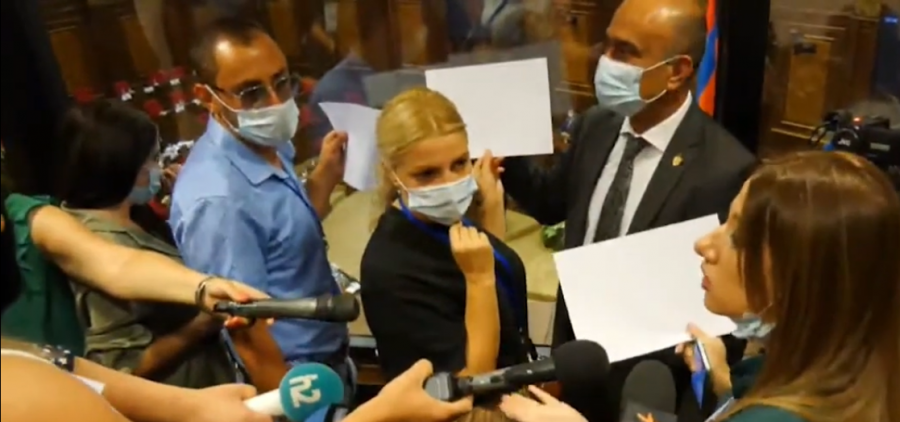 Լրագրողները Ազգային ժողովում Նիկոլ Փաշինյանի ելույթի ժամանակ բողոքի ակցիա են իրականացրել՝ բողոքելով ԱԺ-ում իրենց գործունեության սահմանափակումների դեմ: