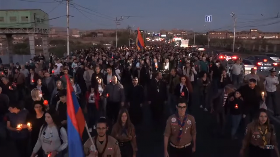 Գարեգին Նժդեհի հրապարակից Սուրբ խաչի և պետականությունը խորհրդանշող դրոշների առաջնորդությամբ մեկնարկեց «Հայաստան» դաշինքի կազմակերպած երթ-մոմավառությունը դեպի «Եռաբլուր» զինվորական պանթեոն։